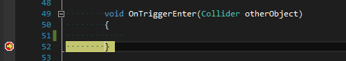 為了驗(yàn)證碰撞器與觸發(fā)器的區(qū)別,現(xiàn)設(shè)計(jì)一個簡單的游戲,讓小汽車與小球發(fā)生碰撞。新建一個C#腳本文件,把它拖給小汽車對象,雙擊該腳本文件進(jìn)入腳本編輯器,在該腳本中加入如下兩個方法,并分別設(shè)置一個斷點(diǎn):