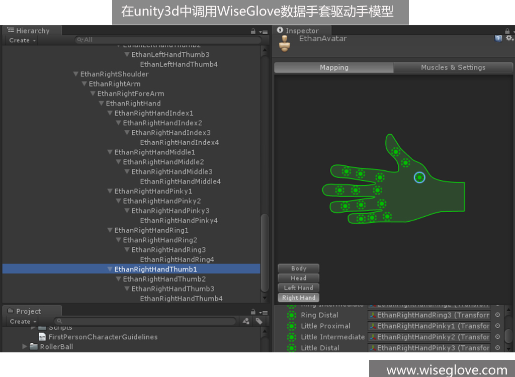 WiseGlove數據手套驅動unity3D游戲角色右手模型關節